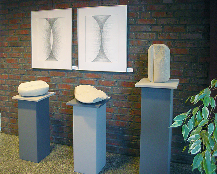 Neben Skulpturen in Holz und Stein entstehen zweidimensionale Arbeiten vorwiegend nach Konzepten und/oder in Arbeitsreihen.